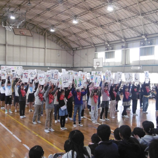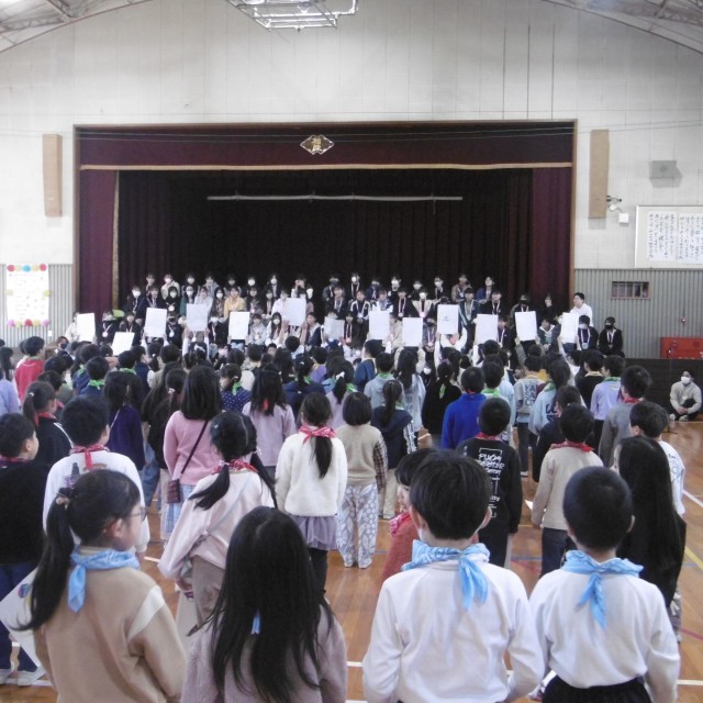 一人一文字のメッセージはそれぞれのクラスで考えた『感謝』『あこがれ』『応援』『お別れ』の全108文字です。