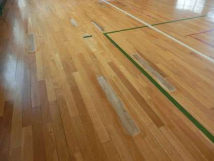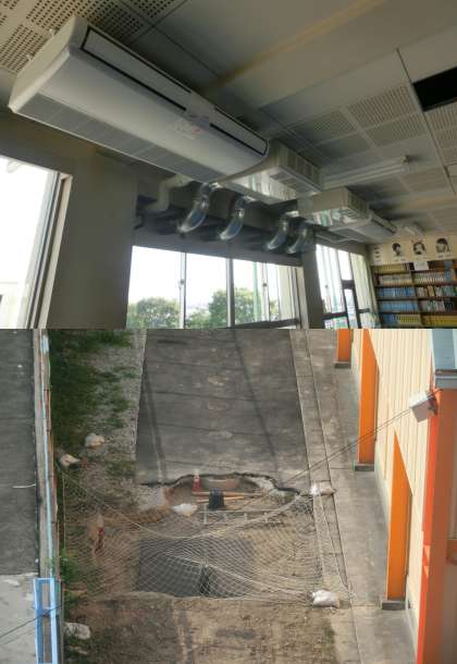 8月15日(木)、校内の工事は今日までお休みで行われていません。図書室のエアコンは、室内の取り付け工事がほとんど終わっています。プール東の災害用マンホールトイレの貯留槽の工事は、貯留槽の埋設が済んだところです。体育館の床の修理は終了しました。