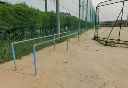 8月16日(金)、雨水調整池の工事が再開されました。今日は、一輪車の練習で使っている平行棒が、北側のバックネットの横に移されました。