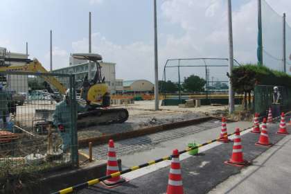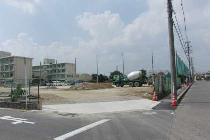 学校の南東角が大きく開き、コンクリートが打設されました。ミキサー車や大型トラック、クレーン車などが出入りしています。その角からもう少し北に下がったところも大きく開き、コンクリートを打設していました。現場には警備の方が安全を確認してくださっていますが、通行される際は十分気をつけるようにしましょう。