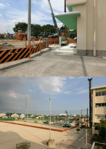 小学校では、雨水調整池工事が始まっています。2棟の昇降口前がせまくなっているので、出入りに気をつけてください。グランドも仮囲いでせまくなっているので、気をつけて遊んでください。