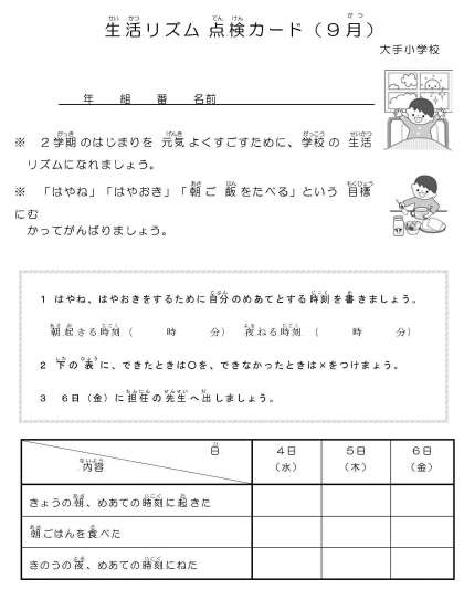 9月4日(水)、学校生活のリズムを取りもどすために今日から3日間、『生活リズム点検カード』を朝の会でつけています。「はやね」「はやおき」「朝ごはんを食べる」を目標として、「寝た時刻」「起きた時刻」と「朝ごはんを食べたかどうか」を記録していきます。ご家庭でも協力をいただき、3つの目標をがんばり、2学期のはじまりを元気よく過ごしましょう。