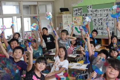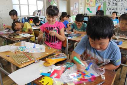 3年生 図工授業のようす 公開日 2013/09/05 更新日 2013/09/05 3年生 9月5日(木) 3年生の図工授業のようすです。透明のうちわにカラーセロファンを貼ってステンドうちわを作りました。子どもたちは、窓からの光に当てて「きれいだね。」と言って友達の作品を見合っていました。
