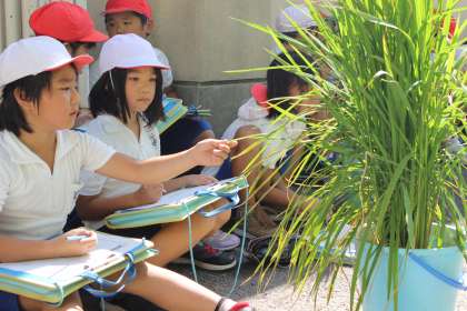 3年生 バケツ稲の観察のようす 公開日 2013/09/06 更新日 2013/09/06 3年生 9月6日(金) 3年生の総合学習のようすです。今日は、3年生が育てているバケツ稲の観察をしました。稲は夏休みの間にすくすくと育ちました。高さを測ったら100cm以上でした。子どもたちは、身長くらいに伸びた稲を見て、驚いていました。「葉がザラザラしている!」「花がすごい小さい!」「穂ができてる。でもまだ緑色だ。」と言いながらしっかり観察していました。