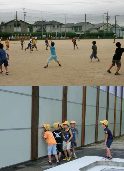 9月6日(金)、朝の運動場のようすです。モクモク(芝生広場)が工事中のため、運動場でたくさんの子どもたちが遊んでいます。工事用の囲いも、子どもたちには遊び場になっています。