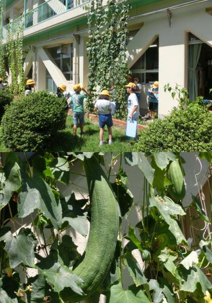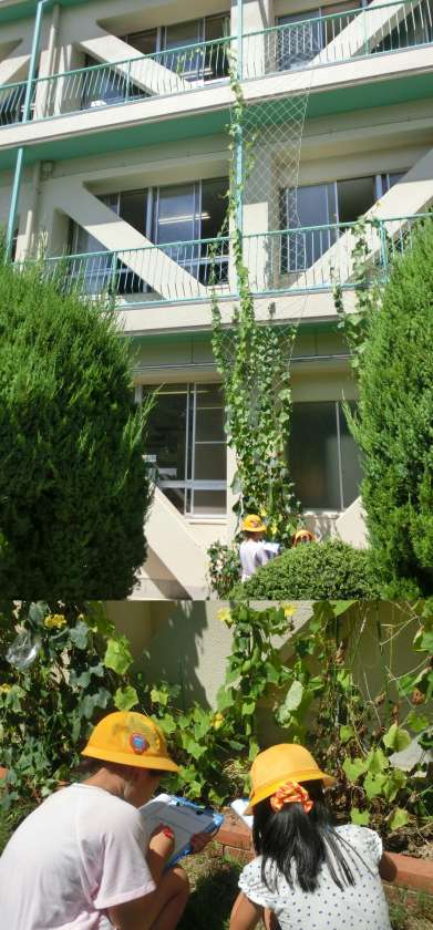 9月6日(金)、4年生がヘチマの観察をしていました。校舎の3階まで伸びたヘチマには、大きな実がいくつもできていました。