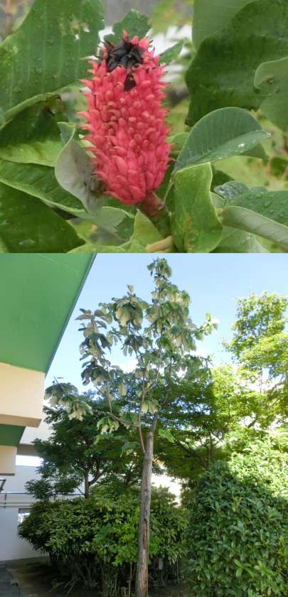 観察池の横に植えられている朴の木(ほおのき)に、20cmほどの朱色の実が成っていました。木の一番高いところに実があるので、3階の教室からでないとよく見られません。果実は袋果(たいか)で、たくさんの袋がついており、それぞれの袋に種子が入っています。