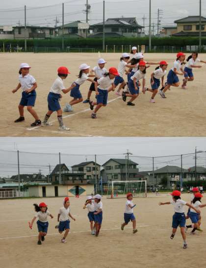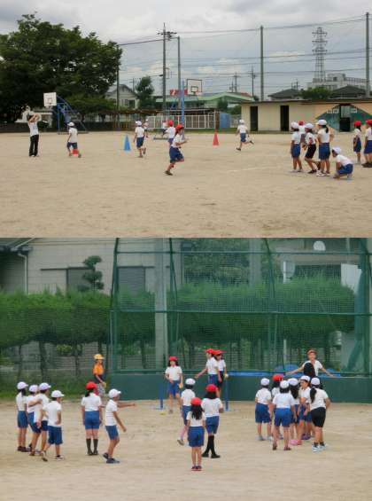 9月10日(火)、2・3・4年生の体育授業のようすです。2・3年生は、かけっことリレー、4年生はティーボールの練習をしていました。
