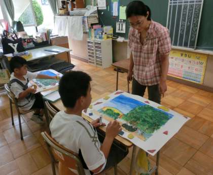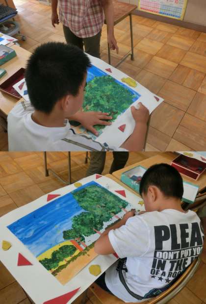 9月11日(水)、5・6組の図工授業のようすです。絵の具を使って、校内の風景を描きました。指につけた絵の具を何度も塗り重ねながら、樹木を表しました。今日は、台紙に貼った絵の周りを飾り付けました。