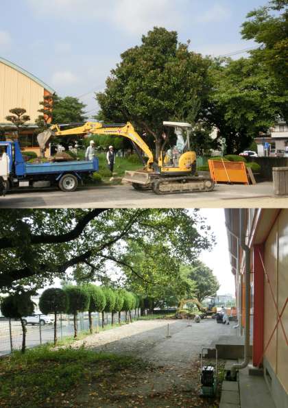 昨日9月12日から、体育館の北側で、駐輪場の工事が始まりました。雨水調整池工事のため運動場が狭くなり、運動会や地区の行事などでグランドに自転車を置くスペースが少なくなりました。そのため、体育館北側の野草園を整備して駐輪場を設置することになりました。正門横からの進入路確保と土取りをしてから、駐輪場予定地に採石を敷いています。