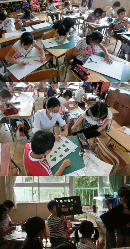 9月13日(金)、2年生の図画工作と国語、4年生の算数授業のようすです。2年生の図画工作 『ひかりのプレゼント』 は、下書きをもとに黒色の厚ボールにわくを開けていました。