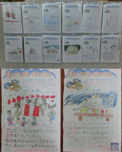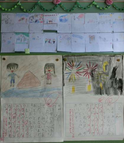 1〜4年生の教室掲示のようすです。夏休みの思い出が、絵日記・絵・新聞でまとめられていました。写真は、1・2年生の掲示です。