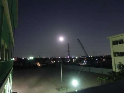 写真は、午後6時40分頃に大手小学校から撮影した月のようすです。東の方角からのぼって南の空に上がっていき、夜中の12時頃にいちばん高くなります。