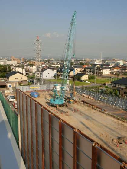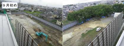 8月から始まった雨水調整池は、調整池の掘削のために土留め用の鋼板の打ち込みが進められているところです。モクモクがあったころのようすと比べると、大きく変わっています。