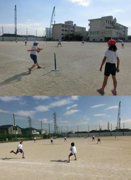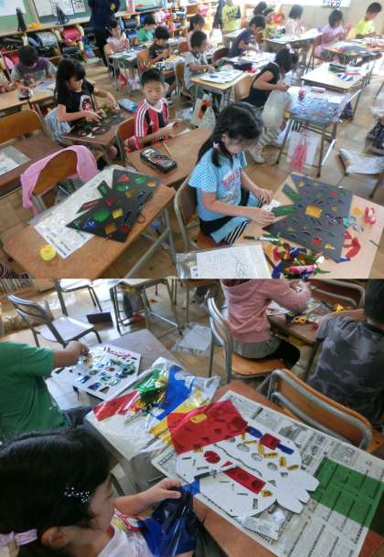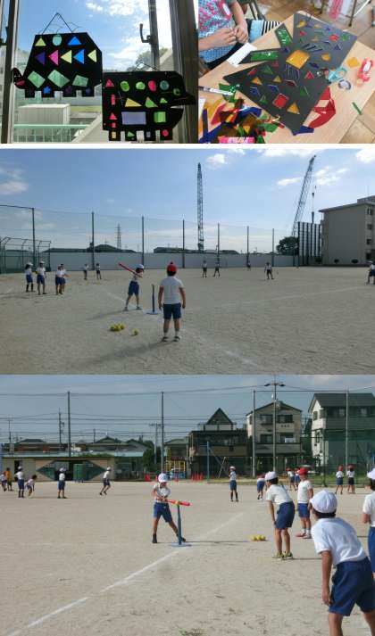 9月27日(金)、2年生の図画工作と4年生の体育授業のようすです。2年生は、「光のプレゼント」の色セロファンを使った作品がもうすぐ出来上がります。4年生は、「ベースボール型ゲーム」で、ティーボールを使ってゲームをしていました。