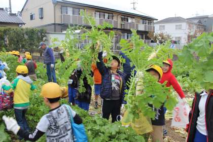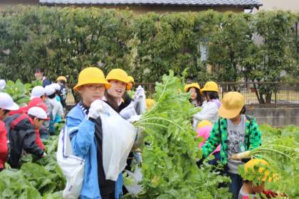 3年生は、近所の農家の畑をお借りして、ニンジン・ダイコン・赤カブ抜き体験をさせていただきました。子どもたちは、大きな葉っぱに大喜び!持ち帰るのに重くて大変そうでしたが、その分多くの感謝の気持ちを感じていたようです。
