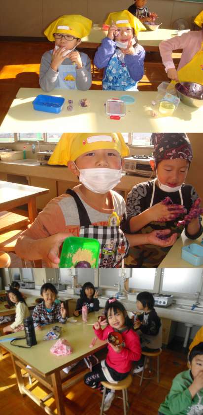 11月26日(火)・27日(水)、1年生がさつまいもでだんごを作りました。はじめての調理、三角巾とエプロンを身につけて取り組みました。おいしいさつまいもだんごが出来上がりました。