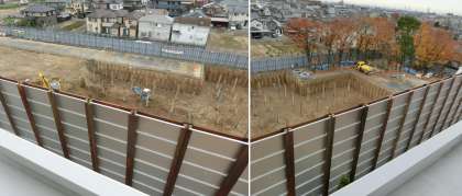 11月30日(土)、雨水調整池工事のようすです。調整池予定地の掘削が、2棟校舎の昇降口あたりまで進められています。
