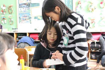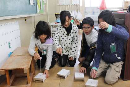 12月5日(木) 3年生図工授業のようすです。ゴムの元に戻る力を利用して、おもちゃの動く仕組みを作りました。組み立ては難しかったですが、友達と協力して楽しく作ることができました。