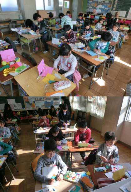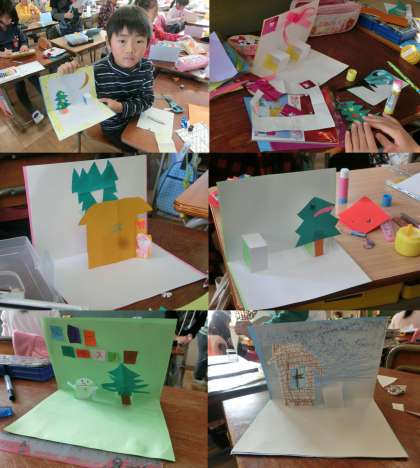 12月5日(木)、2年生の図画工作授業のようすです。国語の説明文『しかけカードの作り方』を読み取り、飛び出すしかけを利用したクリスマスカードを図画工作の時間を利用して作っていました。クリスマスツリーや雪だるま・サンタクロースが飛び出してくる等、それぞれ工夫しながらカード作りをしています。できあがりが楽しみです。
