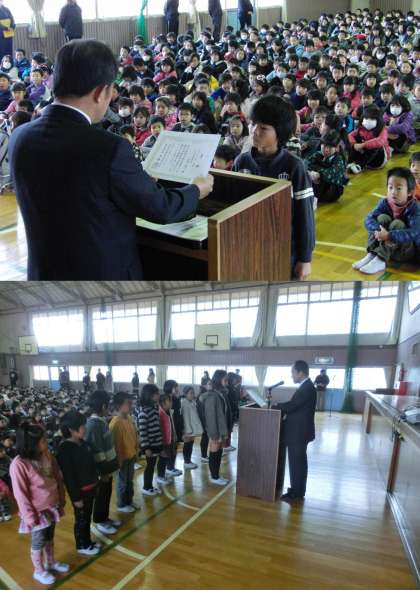 12月5日(木)、朝会を行いました。はじめに表彰を行いました。校長先生からは、人権週間のお話がありました。最後に、遊具の使い方と竹馬の片付け方について話を聞きました。寒い体育館でしたが、静かに入退場をして、お話も全員がとても静かに聞くことができました。