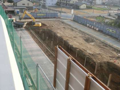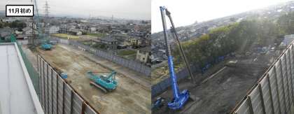 雨水調整池工事のようすです。調整池予定地の掘削が進められています。3回に分けて10m掘削する予定で、3.5mの深さまで一次掘削が行われます。一次掘削が終わると、土留めの補強のため、縦横にH鋼が渡されていきます。いちばん下の写真は、昨日12月6日の工事のようすです。