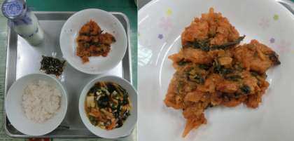 12月12日(木)、今日の給食献立は、「麦ごはん・牛乳・わかめスープ・『冬野菜たっぷり えびのチリソース』・小女子のつくだ煮」です。