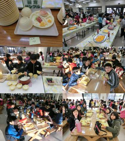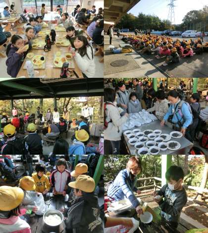 「野外学習の思い出」の続きが遅くなり、すみせんでした。2日目の朝のつどい、朝食、おにぎり作りのようすです。