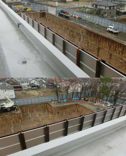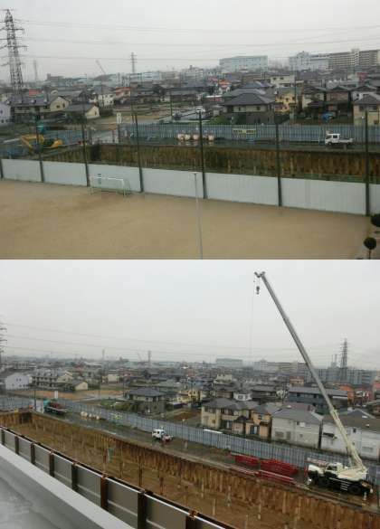 12月18日(水)、雨水調整池工事のようすです。調整池予定地を3.5mの深さまで掘る一次掘削が終わりました。1棟4階の理科室からも、掘り下げられたようすが見えます。これから、土留めの補強のため、縦横にH鋼が渡されていきます。