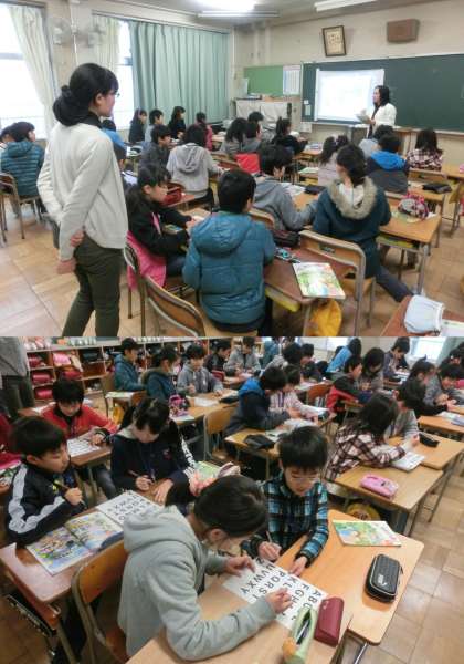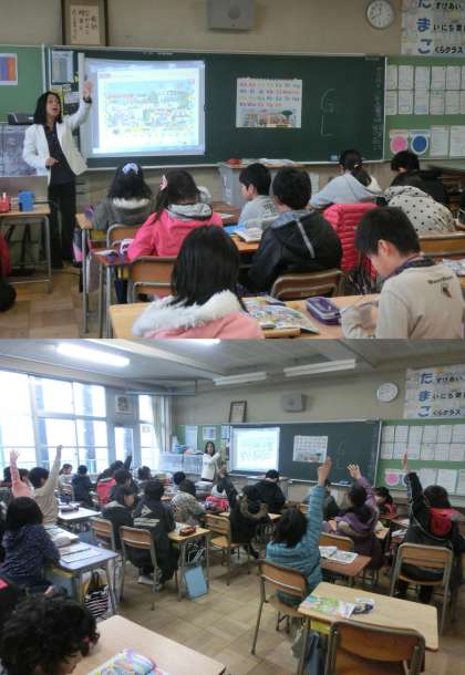 12月18日(水)、ALTのジェシカ先生による5年生の外国語活動のようすです。先生から聞いたアルファベットで始まる単語を教科書の絵の中から見つけ、単語を発表していました。次に、先生が言った単語の最初のアルファベットを隣同士で見つける活動をしました。今日で、2学期のジェシカ先生の授業は終わりでした。ジェシカ先生、ありがとうございました。3学期もよろしくお願いします。