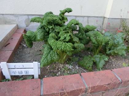 12月25日(水)、最低気温は0度近かったですが、昼間は10度ほどまで上がり、風もなく穏やかな一日でした。校内の木々は葉をすっかり落としていますが、学年で育てている野菜は元気です。学年園には、学年で育てている大根が3学期の収穫を待っています。保健室前には、6年生が学級で育てているかぶ元気よく葉を広げています。