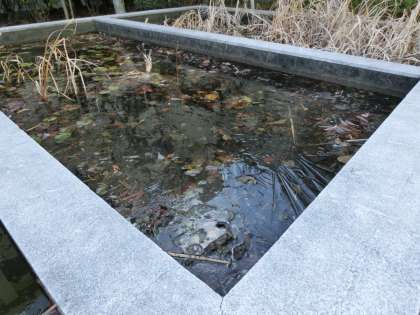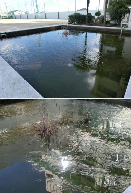 1月6日(月)、観察池のようすです。今朝の名古屋地方気象台の最低気温は、マイナス1.1度でした。昼間も北風が吹き、肌寒い一日でした。観察池にも氷が張り、一日中溶けることがありませんでした。明日の朝も氷点下になりそうな寒い一日が予想されています。明日の始業式に備えて、今日は早めに寝ましょう。