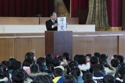 さて、この漢字は、読めますか?そうですね。「干支(えと)」です。今年は、「午年(うまどし)」です。実は、干支は、十個の漢字とみなさんがよく知っている「えと」の12種類を組み合わせて、60の「干支」からできています。正しくは、今年は、「甲午(きのえうま)」といいます。60年で一回りするのが干支です。今日は、12種類の生き物であらわす干支についてお話しします。今年の年男・年女になる「午年」の人は、手を挙げてください。(「巳年(へびどし)」「未年(ひつじどし)」「申年(さるどし)」「酉年(とりどし)」「戌年(いぬどし)」「亥年(いのししどし)」と順に手を挙げてもらいました。6年生から1年生まで、7つの干支に分かれますね。みなさんは、一学年ずつ進級しながら年を重ね、干支を一回りすると小学校を卒業します。