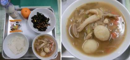 1月9日(木)、今日の給食献立は、「ごはん・牛乳・『だまこ汁』・ひじきの煮物・みかん・黒豆」でした。