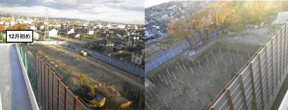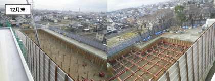 雨水調整池工事のようすです。土留めの補強のため、打ち込まれたH鋼に縦と横の鋼材を溶接していきます。その後、現在よりも3m50cm掘り下げる2次掘削が始まります。