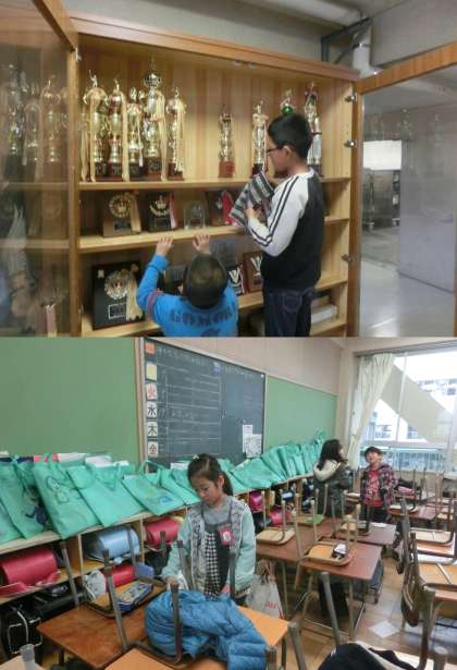 3月18日(火)、大そうじのようすです。1年間お世話になった教室や机・椅子、担当のそうじ区域を、一生懸命きれいにしました。6年生は、教室の掲示物をはずし、6年間お世話になったトイレの床やくつ箱の掃除をしていました。