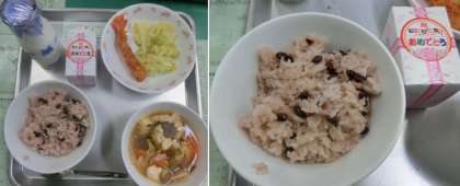 3月19日(水)、今日の給食献立は、「『赤飯・えびフライ・お祝いデザート』・牛乳・けんちん汁・ボイルキャベツ・卓上ごま塩・卓上ソース」でした。
