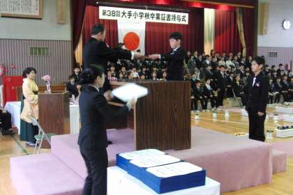 さて、卒業生のみなさん。みなさんと出会ってからの二年間のことを思い出しながら、卒業証書を一人一人に渡しました。みなさんが手にしている卒業証書は、小学校で学ぶべきことを全て学び終えたという、六年間の努力の証です。そして、この大手小学校の卒業生であるという証明書を受け取ったわけです。是非とも、大手小学校の卒業生としての誇りを持ち、中学校に行っても、自信と勇気を持ってがんばってほしいと心から願っています。