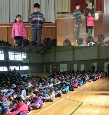 3月24日(月)、25年度の修了式を行いました。はじめに、校長先生から修了証を受け取りました。どの学年の代表もしっかりと返事をして、学年ごとに受け取る姿からは、1年間の成長を感じました。校長先生の話を聞いた後、4年生と1年生の代表が、1年間のまとめを発表しました。4年生の男子からは、市の音楽会に出場したことが、1年生の女子からは、5月の運動会でがんばったことが発表されました。最後に、5年生女子の伴奏で、全員で校歌を合唱しました。卒業式で校歌を合唱した5年生は、下のパートを歌い、体育館に美しい歌声が響き渡り、25年度を締めくくるにふさわしい校歌合唱でした。