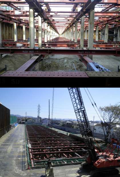 雨水調整池工事のようす 公開日 2014/04/06 更新日 2014/04/06 雨水調整池工事 雨水調整池工事のようすです。2次掘削が終わり、10mまで掘り下げる3次掘削が始まりました。今回は、工事業者の方からいただいた地下の工事現場の写真を紹介します。補強用の鋼材が地下まで組み上げられているようすがよくわかります。