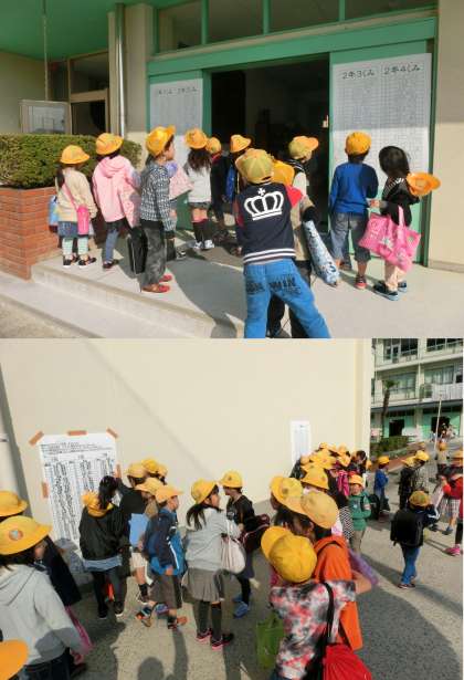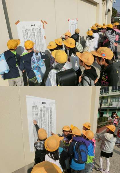 4月8日(火)、昨日の入学式に続いて2〜6年生が今日から登校して、全校がそろいました。登校後、さっそく張り出されている新学年のクラス発表を見て、新しいクラスとクラスメイトを確かめていました。