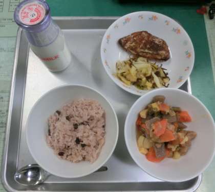 4月10日(木)、今年度最初の給食献立は、「赤飯・牛乳・筑前煮・あじの竜田揚げ・キャベツの塩昆布あえ・卓上ごま塩」でした。
