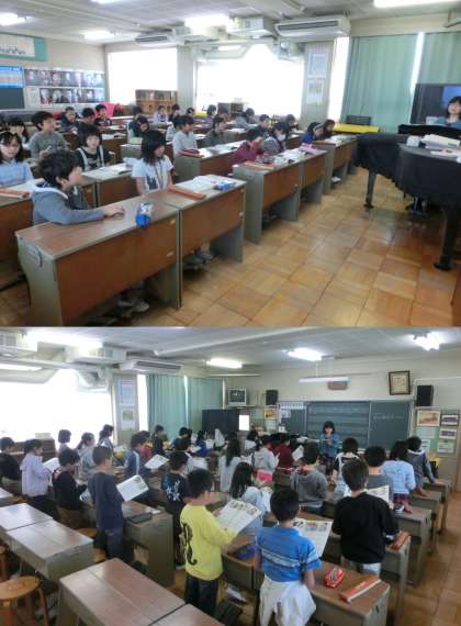4月14日(月)、5年生の音楽授業のようすです。3年生以上は音楽の先生から、1・2年生は担任の先生から授業を受けます。