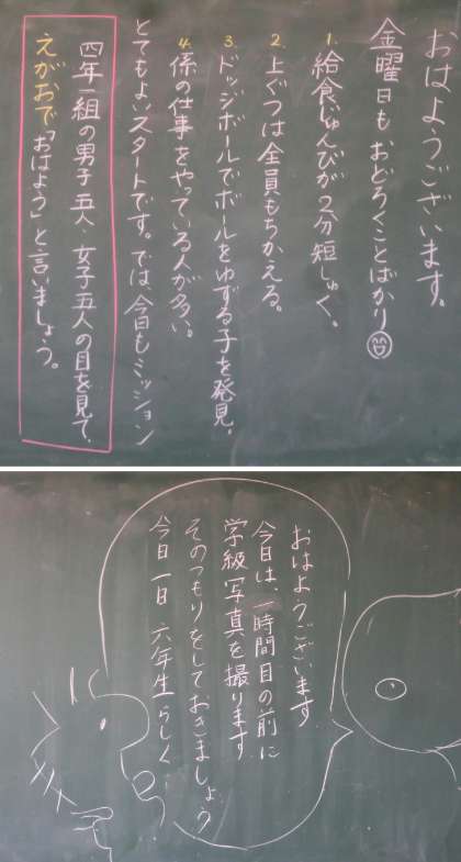 子どもたちが登校する前の、教室の黒板のようすです。昨日のできごとについて先生の言葉や今日の心構えなど、それぞれ工夫した言葉が書かれていました。担任の先生と子どもたちの手で、新しい学級が少しずつできています。