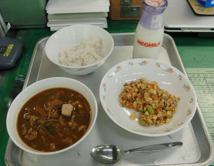 4月16日(水)、今日の給食献立は、「麦ごはん・牛乳・『あさりのみそ汁』・豚そぼろ」でした。