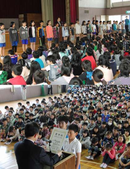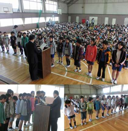 任命式の後、少年野球チームの表彰と校長先生の話がありました。最後に、生活指導の先生から、廊下や階段の歩き方について話がありました。放課に運動場に出かけるときやもどってくるときに、けがをしないために正しい歩き方を身につけていきます。