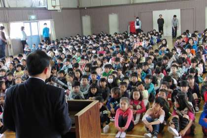 2つめは、始業式で話した「4つの『あ』についてです。4つの「あ」の中でも、今年は「あいさつ」と「あんぜん」をがんばろうと話しました。今朝、正門ですばらしい班長さんに出会いました。その班長さんは、大きな声であいさつをしてくれました。そのあと、後ろに並んでいる下級生の子たちに、「校長先生に大きな声であいさつをするんだよ。」と教えていました。すると、どの子も元気よくあいさつをしてくれました。こんなふうに、あいさつが元気よくできる子が増えていくと、あいさつの声でいっぱいの大手小学校になるでしょう。楽しみにしています。