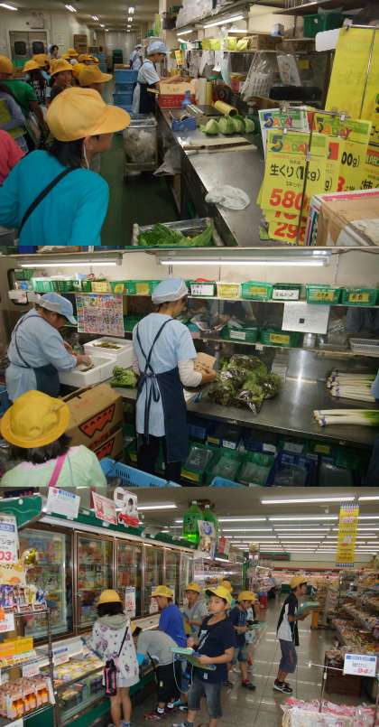10月8日(水)、3年生が、校区にあるスーパーマーケットへ見学に行きました。働く人のようすやお店の工夫などを知ることができました。子どもたちは、事前に考えた質問を一生懸命したりメモを取ったりして、有意義な時間を過ごすことができました。売り場の奥(バックヤード)も見学させていただき、「店のおくでキャベツを切っていたよ。」「魚やお肉を切っているところを見たよ。」「魚の頭が置いてあったよ。」と、たくさんのことを聞かせてくれました。この経験を生かして、新聞作りをがんばります。スーパーマーケットのみなさん、お忙しい中を見学させていただき、ありがとうございました。