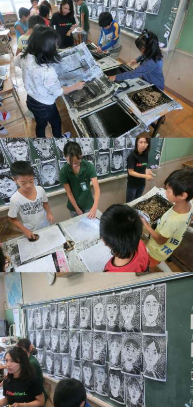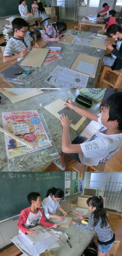 10月14日(火)、4・5年生の図画工作授業のようすです。4年生は、はじめて刷った作品を見ながら手直しをして、2度目の版画刷りをしていました。伝言板作りに取り組む5年生は、板の形を生かして、どんな作品を作ろうかと考えていました。