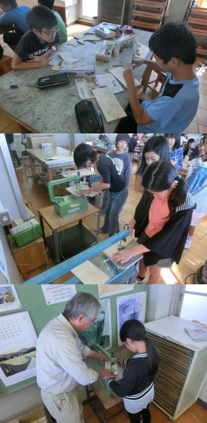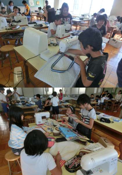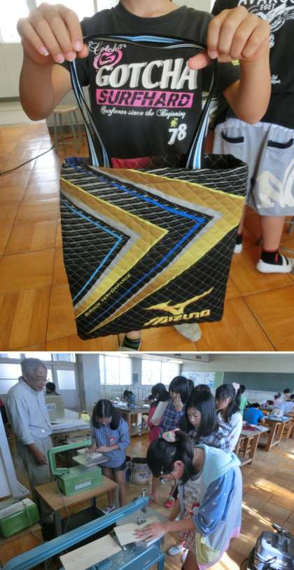 6年生の家庭科と図画工作授業のようすです。家庭科は、ミシンを使ってトートバッグ作りに取り組んでいました。図画工作は、『板から何が』の単元で、テープカッターを作っていました。